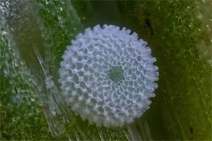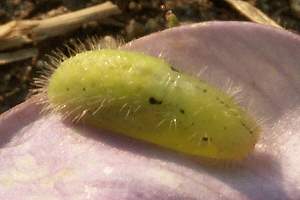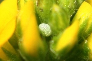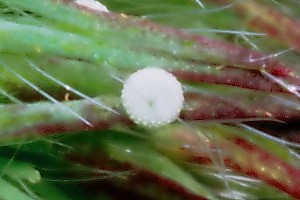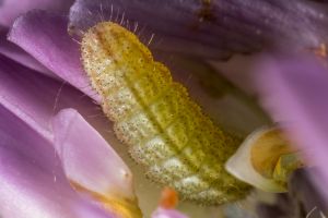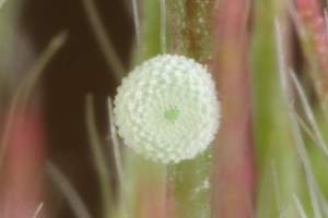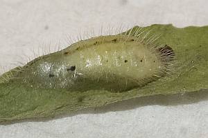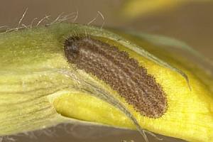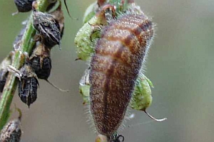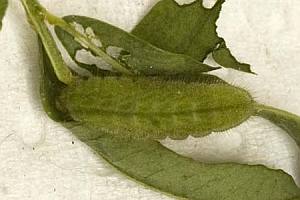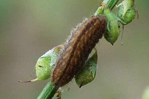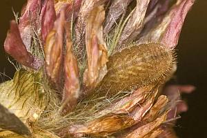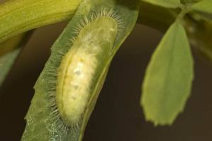 E. Rennwald diskutiert die 10 von ihm beobachteten Freiland-Eiablagepflanzen der Art: Trifolium pratense (Rot-Klee), Lotus corniculatus (Gewöhnlicher Hornklee), Lotus uliginosus (Sumpf-Hornklee), Melilotus alba (Weißer Steinklee), Medicago sativa (Luzerne), Medicago falcata (Sichelklee), Medicago lupulina (Schneckenklee, Hopfen-Luzerne), Vicia cracca (Vogel-Wicke), Lathyrus latifolius (Breitblättrige Platterbse) und Colutea arborescens (Blasenstrauch) dazu noch 2 weitere Eiablagepflanzen anderer Beobachter: Vicia sativa (Saat-Wicke) und cf. Lathyrus maritimus (Strand-Platterbse) [Lepiforumsbeitrag Erwin Rennwald vom 24. September 2010]. Hinzu kommen noch Lathyrus cf. sylvestris (Wilde Platterbse, siehe Bilder weiter oben) und ein Ausnahmefund an Trifolium medium (Mittlerer Klee) [Lepiforumsbeitrag Gabriel Hermann vom 29. Juli 2008]. Völlig aus dem Rahmen fällt eine Eiablagebeobachtung an Blutweiderich (Lythrum salicaria) [Lepiforumsbeitrag Gabriele Krumm vom 14. August 2006] - ob sich hier eine erfolgreiche Larvalentwicklung anschloss, muss offen bleiben.