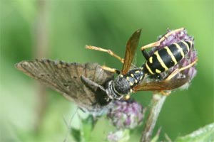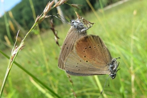 Ameisenkenner sind zwar Hymenopterologen, aber über Schlupfwespen wissen sie in der Regel auch nicht mehr als Lepidopterologen ! Zum Verständnis der Bestandsentwicklung von Phengaris nausithous sollten sie aber wenigstens eine der vielen tausend Ichneumoniden-Arten kennen: Neotypus melanocephalus. Ebert & Rennwald (1991: 312) mussten noch vorsichtig vermelden: "In diesem Zusammenhang erwähnenswert scheint eine von G. Ebert und A. und S. Heitz unabhängig voneinander in der nördlichen bzw. mittleren Oberrheinebene angestellte Beobachtung zu sein: Eine Schlupfwespe fliegt die von M. nausithous besetzten von Sanguisorba officinalis an, in die hinein es offensichtlich ihre Eier legt (vgl. Abb.). Nach H. Hilpert handelt es sich dabei um Neotypus melanocephalus (Gmelin, 1790), "die häufigste Art der Gattung, die aber insgesamt recht selten ist." [...] Über die Biologie von Neotypus melanocephalus sei jedoch (jedenfalls bis 1981) noch nichts bekannt. Nach unseren Beobachtungen kommt als Wirt dieser Art der Bläuling Maculinea nausithous in Betracht. Ob der Parasit mit der Wirtslarve auch in das Ameisennest gelangt und in welchem Stadium das sein könnte, entzieht sich leider unserer Erkenntnis." Einmal darauf aufmerksam gemacht, konnte ich Ende der 1980er und Anfang der 1990er Jahre am Mittleren und Nördlichen Oberrhein quasi in jeder größeren Phengaris nausithous-Population stets auch eine Anzahl dieser speziellen Schlupfwespe bei der Eiablage in Wiesenknopf-Köpfchen beobachten. Tatsächlich ist auch diese Art mittlerweile relativ gut studiert. Sie ist hochspezialisiert auf Raupen von Wiesenknopf-Ameisenbläulingen (zumindest in der Regel P. nausithous). Das Schöne: Diese Schlupfwespenart ist recht auffällig und auch für Laien relativ gut ansprechbar. Pfeifer (2016) zählte 2014 in einem Sommer jeden Tag Männchen und Weibchen der Phengaris-Bläulinge in einem 4,7 km langem Transekt in der Pfalz, dazu auch die Individuen der mit der Eiablage in Wiesenknopf-Köpfchen beschäftigten Ameisenbläulings-Schlupfwespe (Neotypus melanocephalus). Bei der täglichen Zählung zeigte sich, dass sich die Fluzeit von Bläuling und Schlupfwespe zwar stark überschnitten, dass der Schwerpunkt von Neotypus melanocephalus aber 2-3 Wochen nach demjenigen von Phengaris nausithous-Weibchen lag. Den eierlegenden Schlupfwespen standen also schon Jungraupen zur Verfügung, in die sie ihre Eier hineinlegen konnten. Wie auch andere Schlupfwespen ist das Wachstum der eigenen Larven ganz an das Wachstum der Bläulingsraupe angepasst. Erst nach der Verpuppumg der Raupe werden lebenswichtige Organe angegriffen, die junge Puppe also abgetötet und die Schlupfwespenlarve verpuppt sich im Rest der Schmetterlingspuppe. Statt eines Bläulings schlüpft eben eine Schlupfwespe. Der Besatz kann 70-80 % aller Raupen einer Population machen, hat also Einfluss auf die Anzahlen der Falter.
