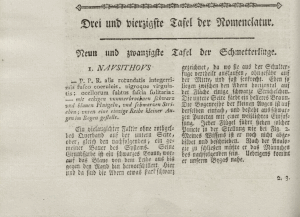 - Erstbeschreibung: Bergsträsser, J. A. (1779): Nomenclatur und Beschreibung der Insecten in der Graffschaft Hanau-Münzenberg wie auch der Wetterau und der angränzenden Nachbarschaft dies und jenseits des Mains mit erleuchteten Kupfern. Zweiter Jahrgang. 1-80, pl. 1-48. Hanau (im Verlage des Verfassers).