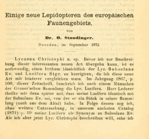- Erstbeschreibung: Staudinger, O. (1874): Einige neue Lepidopteren des europäischen Faunengebiets. — Entomologische Zeitung 35: 87-98. Stettin.