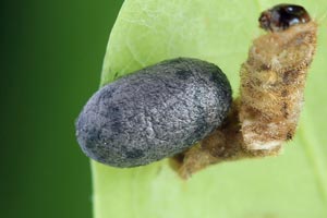 Die Eiablage erfolgt an die Basis von Knospen, in aller Regel an die Basis von Blütenkospen verschiedener Eichen. Stiel-Eiche und Trauben-Eiche werden gleichermaßen belegt. Sie stellen zusammen die wesentliche Lebensgrundlage der Art in Mitteleuropa. Die Flaum-Eiche ist in Mitteleuropa nur im Süden und dort an den wärmsten Lagen zu finden; wo vorhanden wird auch sie als Eiablagepflanze genutzt. Von der aus Amerika stammenden Rot-Eiche gibt es mittlerweile mehrere Fundmeldungen aus Nord- und Südwest-Deutschland; ihr dürfte in Mitteleuropa mittlerweile eine gewisse, wenn auch sicher nicht große Bedeutung als Eiablagepflanze zukommen. Die in der Liste erwähnte Schlehe ist sicher eine Ausnahme und eher als Kuriosum zu sehen; sie beruht auf dem Fund einer nahezu erwachsenen Raupe an dieser Pflanze, die in der Zucht auch weiter angenommen wurde (siehe Bildlegenden oben).