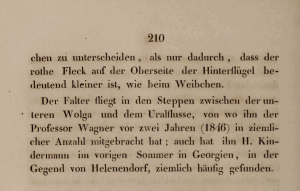 Eversmann (1848) hatte in seiner Erstbeschreibung erläutert: "Der Falter fliegt in den Steppen zwischen der unteren Wolga und dem Uralflusse, von wo ihn der Professor Wagner vor 2 Jahren (1846) in ziemlicher Anzahl mitgebracht hat; auch hat ihn H. Kindermann im vorigen Sommer [1847] in Georgien, in der Gegend von Helenendorf, ziemlich häufig gefunden". Es wurde kein Holotypus ausgewählt und daher auch die Typenlokalität nicht fixiert. Dies holte Nekrutenko in Hesselbarth et al. (1995: 508) nach. Nach Zolotuhin & Anikin (2017: 535) wurde der Lectotypus im ZISP schon 1982 etikettiert, was aber erst 13 Jahre später dann - leider nicht korrekt - publiziert wurde. Von den 5 als Lectotypus und Paralectotypen beschrifteten Eversmann-Exemplaren im ZISP tragen demnach 2 ein Etikett "Grusien", 1 ein Etikett "Indorsk v. Kind." und 2 das, was Nekrutenko als "unlesbar" bezeichnet hat. Genau eines von letzteren Exemplaren wurde aber als Lectotypus fixiert - die Angabe "Grusien" als Typenfundort kann also nicht stimmen. Zolotuhin & Anikin (2017: 535) fragen sich, was es aber sonst sein könnte - und sie entziffern das "unleserlich", indem sie es mit anderen Etiketten vergleichen. Ergebnis: "Calmucc". Und sie erläutern plausibel, dass das nicht die Republik Kalmückien ist, sondern die Stadt Kalmukov im Uralsk Distrikt, 280 km entfernt von Uralsk am rechten Ufer des Ural-Flusses in West-Kasachstan. [Diese erhielt ihren Namen, weil sich hier Kalmücken während der Zeit ihrer Massenflucht aus Russland nach China angesiedelt hatten.]