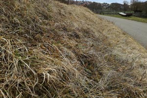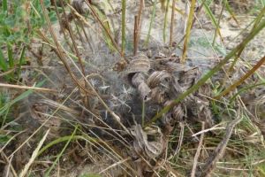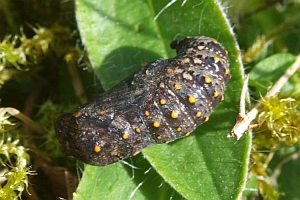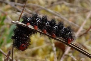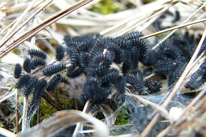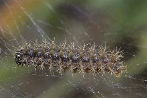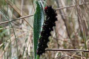 Im Gegensatz zu den anderen Melitaea-Arten besitzt nur die Raupe von M. cinxia eine rote Kopfkapsel in Kombination mit der schwarzen Grundfarbe. (RR)