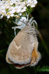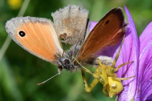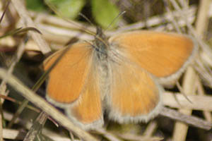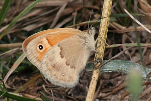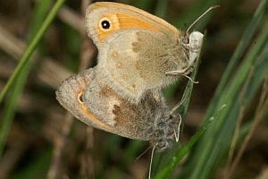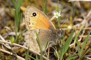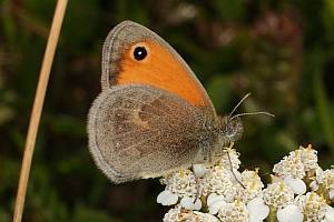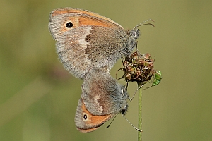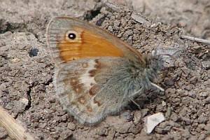 Verwechslungen mit drei Arten der Tribus Maniolini, Pyronia tithonus, Maniola jurtina und Hyponephele lycaon, sind normalerweise wegen der viel kleineren Flügelspannweite von C. pamphilus nicht möglich; im Zweifelsfall hilft wieder ein Blick auf die Hinterflügel-Unterseite: Die Maniolini haben dort entweder überhaupt keine Augenzeichnung oder zwei weit auseinander liegende Punkte, niemals jedoch die für C. pamphilus typische, bogenformige Reihe aus ca. 6 angedeuteten Flecken. Während sich die Maniolini gelegentlich mit ausgebreiteten Flügeln sonnen, zeigt C. pamphilus ohne Fremdeinwirkung nur in seltensten Ausnahmen (wie oben auf Falterbild 4) die Flügel-Oberseite. (Jürgen Rodeland)