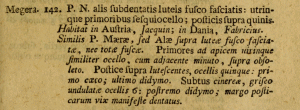 Zu der Linnaeusschen Beschriftung „Ægeria“ bemerken Honey & Scoble (2001: 347): “Verity (1913: 185) steted that the specimen of megera in the LSL was labelled “17 æger.” in Linnaaeus's handwriting. Our interpretation is that the specimen, which we have selected as lectotpye, was labelled “12.” and that Linnaeus added the name “Ægeria” to the label at right angles to the number.”
