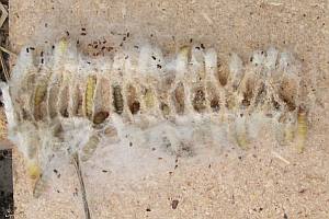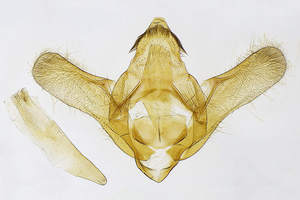 9-10: ♂, Deutschland, Niedersachsen, Landkreis Schaumburg, Rodenberg, 90 m, Garten, Wespennest von Dolichovespula media (Mittlere Wespe) am 13. März 2017 eingetragen, zu dem Zeitpunkt Raupen in Kokons vorhanden, Falterschlupf ab 10. April 2018 (cult., det. & Studiofotos: Tina Schulz)