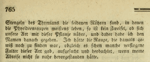 Noch unbekannt! Zeller (1846) hatte den Falter "thymiella" genannt, weil die Imagines oft um und auf Thymian-Pflanzen zu finden sind und weil Zeller am Thymian auch verdächtige Gespinste fand - Raupenfunde gelangen ihm damals aber nicht.