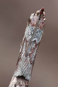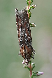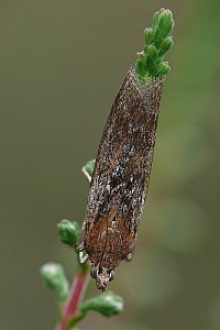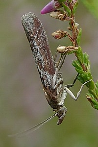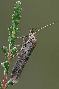 Schütze (1931) führt die Art beim Heidekraut (Calluna vulgaris) an und schreibt: "In außen mit Sand bekleideten Gespinströhren unter den Büschen (Stange). Teucrium montanum (Spuler)." Wie sicher die Angabe zum Berg-Gamander ist, ist noch zu prüfen. Jedenfalls kommt die Art auch in Trockengebieten ganz ohne Heidekraut vor.