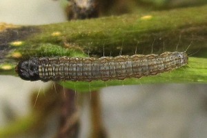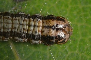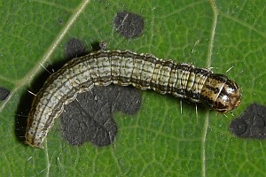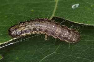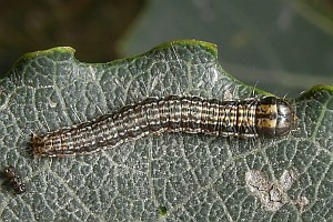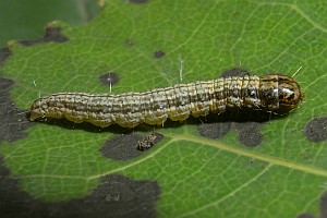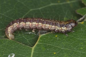 7: letztes Stadium, Deutschland, Niedersachsen, Region Hannover, Rande des Altwarmbüchener Moors bei Klein Kolshorn, 65 m, leg. Blattumschlag mit zwei Jungraupen an Populus tremula (Espe), 19. Juni 2017, Zuchtfoto 29. Juni 2017 (cult., det. & fot.: Tina Schulz)