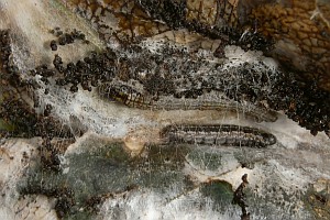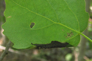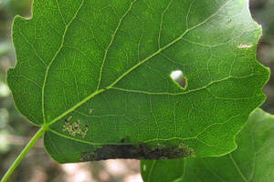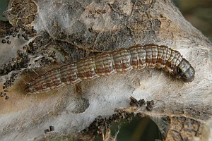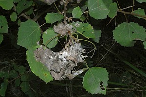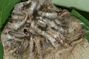 3: Blick in ein geöffnetes Raupennest an Espe (Populus tremula): Deutschland, Sachsen, Dübener Heide, Umg. Doberschütz, 22. Juli 2007 (leg., cult., det. & Foto: Heidrun Melzer)