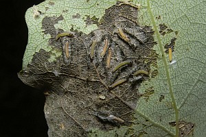 6-8: Blattumschlag mit zwei Jungraupen an Populus tremula: Deutschland, Niedersachsen, Region Hannover, Rande des Altwarmbüchener Moors bei Klein Kolshorn, 65 m, 19. Juni 2017 (det. & Freilandfotos: Tina Schulz)