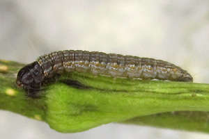 3-4: drittletztes Stadium, Deutschland, Niedersachsen, Region Hannover, Rande des Altwarmbüchener Moors bei Klein Kolshorn, 65 m, leg. Blattumschlag mit zwei Jungraupen an Populus tremula (Espe), 19. Juni 2017, Zuchtfotos 23. Juni 2017 (cult., det. & fot.: Tina Schulz)