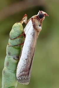 Die Raupen leben gesellschaftlich in einem Gespinst an recht unterschiedlichen, aber wohl meist verholzten Wolfsmilch-Arten, allen voran Euphorbia characias. Cristofaro et al. (1998) prüften, ob sich die Art für die Freiland-Bekämpfung der aus Europa eingeschleppten Esels-Wolfsmilch (Euphorbia esula) in Nordamerika eignet. Tatsächlich wurde diese Pflanze in der Zucht massiv belegt und die Raupen ernährten sich gut von der Pflanze. Dennoch bekamen die Autoren Bedenken, denn es wurden zwar nur Euphorbia-Arten befressen, darunter aber eben auch der Christusdorn (Euphorbia milii), eine sehr beliebte Zierpflanze.