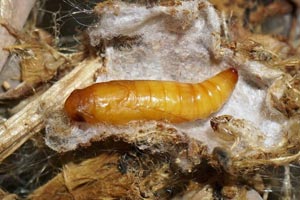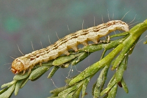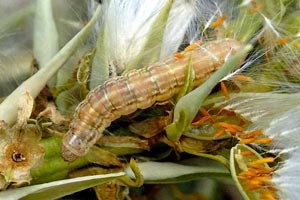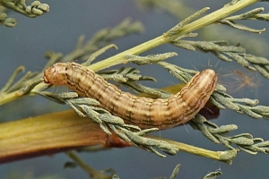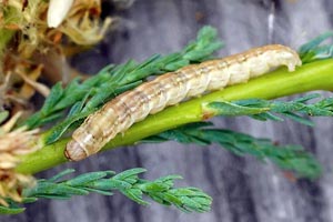 Schütze (1931) konnte auf Bekanntes zurückgreifen und zur Raupe schreiben: "Myricaria (Tamarix) [...] Raupe September bis Frühjahr [...] In den reifen Samenkapseln in einem sehr feinen seidigen Schlauch, an dessen äußerstem Ende sich die Samenwolle anhängt, überwintert in länglicher haariger Hülle, in welche sie Sandkörnchen und Holzspänchen einwebt (Kaltenbach). Süddeutschland."
