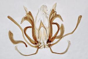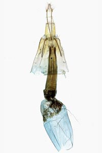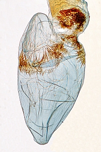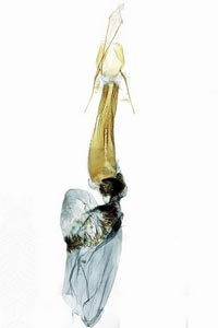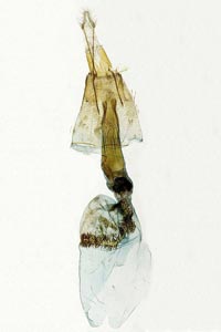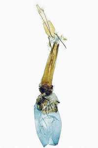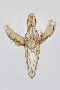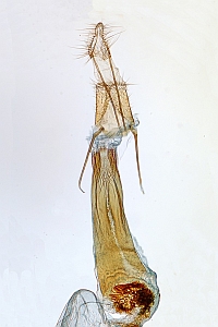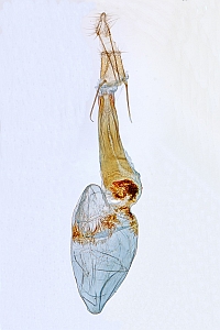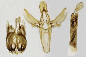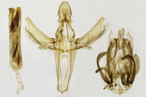 1-3: Genitalpräparat des als Diagnosebild 5 abgebildeten ♂, Deutschland, Baden-Württemberg, 78176 Blumberg, in einem nach Westen zum Wutachtal abfallenden locker bewaldeten Steilhang, 840 m, am Licht, 19. Juli 2016 (leg., gen. det., präp. & Foto: Hans-Peter Deuring), [2] Aedoeagus, [3] CoremataForum
