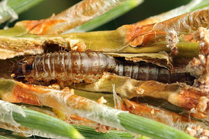1: Russland, Moskauer Gebiet, Bezirk Orekhovo-Zuevsky, Dorf vom 1-go Maya, leg. Befallsbild mit Raupe an Kiefer (Pinus sylvestris) 25. Juni 2019, Falterschlupf 7. August 2019 (leg., cult., det. & fot.: Andrey Ponomarev)Forum