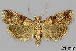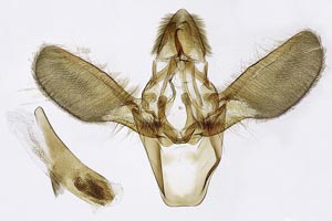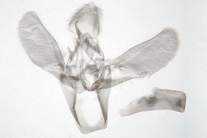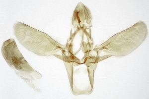 Acrobasis tumidana: Anellus V-förmig, die zwei gegenüberliegenden Strukturen weniger geschwungen bzw. annähernd gerade, vergleiche hier [mothdissection]