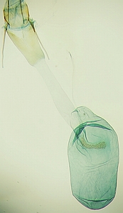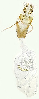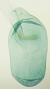 1: Genitalpräparat eines nicht abgebildeten ♀, Österreich, Wien, Lobau, 24. Juli 2004 (leg. & det. Oliver Rist, conf. durch GU und Mikro-Foto: Peter Buchner) Der deutlichste Unterschied gegenüber Nyctegretis lineana findet sich in der Form und Lage des Signums: Rundlich bei Nyctegretis lineana, langgestreckt und quer liegend bei N. triangulella