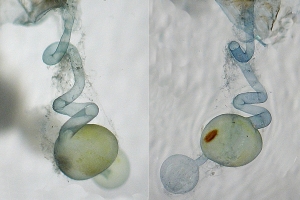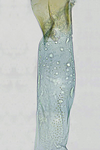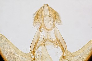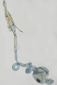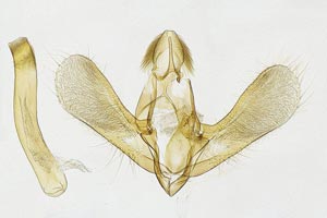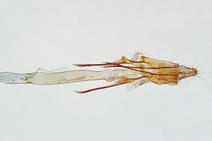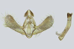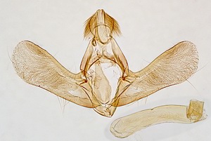 1-3: ♀, ♀: Deutschland, Baden-Württemberg, 78176 Blumberg, Ortsrandlage, Südhang, in Waldnähe (Buchen-Mischwald, Waldrand mit anschließendem Trespen-Halbtrockenrasen auf Kalk), 720 m, 4. August 2012, am Licht (leg., gen. det. & Foto: Hans-Peter Deuring) [1] Gesamtansicht; [2] im Wasserbad die Bursa copulatrix mit dem ovalen Signum und der Ductus bursae mit seinen charakteristischen zwei Schleifen; [3] Das lange Colliculum.Forum