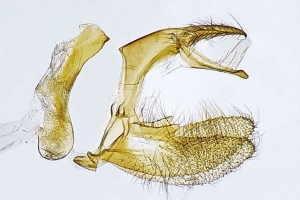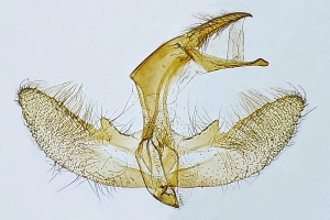 Flügel eher dachförmig als gewölbt geschlossen; Palpenenden breit abstehend beschuppt; weiße Längsstrieme gegabelt und mit costalwärtig anliegender Verdunkelung. [Oliver Rist im Forum].
