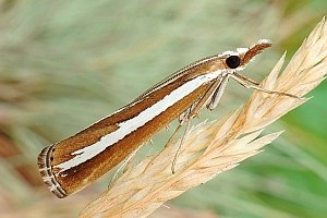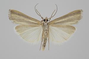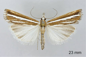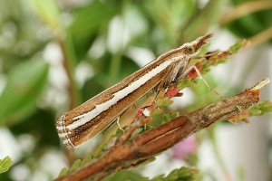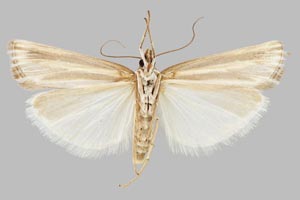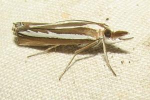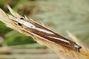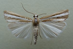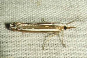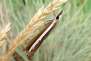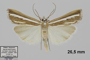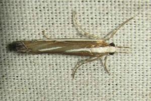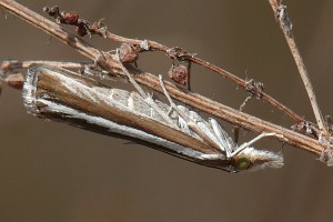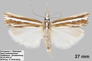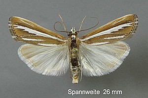 Durch die glänzend weißen Hinterflügel ist die Art schon im Flug kenntlich. So hell kommt sonst keine Crambidae daher, obwohl die Vorderflügel dunkel sind. (Friedmar Graf)