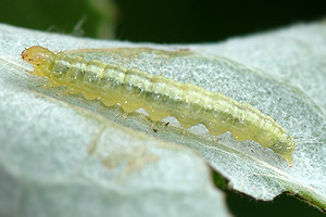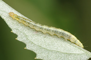 Ian Smith beschreibt die Raupe auf [ukmoths.org.uk] und listet auf: "Foodplant: Many plants, including; Succisa, Tussilago, Calystegia, Heracleum, Rumex, Rubus, Centaurea, Plantago, Fragaria, Cirsium and Artemisia. Sept. - June. Under a white web on underside of leaf. Narrow leaves may be spun into a tube."