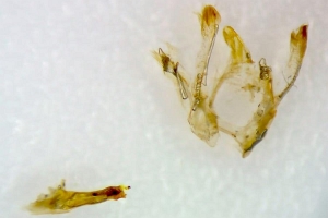 C. hyponoea sp. n. (4 e). Sehr ähnlich einigen (sehr seltenen) Stücken von ruficiliaria ab. privataria, bei denen schlecht umgrenzte Subterminalflecke entwickelt sind, so gelagert wie etwa bei porata; Zellpunkte dunkel geringt, ebenfalls wie bei porata) [Klammer überflüssig, Anm. Red. Lepiforum], aber äußerst klein. Fransen ohne die rote Linie, sogar unterseits, wo sie bei ruficiliaria die konstantere ist; Medianschatten im Vflgl gestaltet wie bei porata, aber sehr schwach. Genitalien ähnlich denen von ruficiliaria, aber die Keule der Fibula zu einer Platte verbreitert, ein Uebergang zu der von porata. Philippeville, Algerien, Type ein ♂ (Dr. A. Seitz, 18. Juni 1913) und 1 ♀ (K. Dietze, Mai 1909) in meiner Sammlung; Ain Draham, Tunis, 2 ♀♀, 1 in Dr. Werhlis Sammlung, die andere im Tring-Museum. Ist wahrscheinlich unter den mannigfachen Formen von pupillaria übersehen worden; vielleicht bezieht sich auch das erwähnte Vorkommen von ruficiliaria von Aegypten auf hyponoea.“