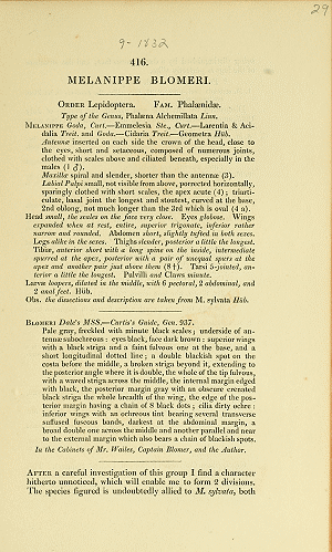 - Erstbeschreibung: Curtis, J. (1823-1840): British Entomology; Being Illustrations and Descriptions of the Genera of Insects Found in Great Britain and Ireland: Containing Coloured Figures from Nature of the Most Rare and Beautiful Species, and in Many Instances of the Plants upon which they are Found. Vol VI. Lepidoptera, Part II. — [Not paginated]. London (E. Ellis & Co.).