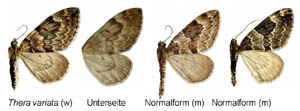 "Die Männchen von Thera variata und Thera britannica können anhand der Fühler unterschieden werden (Lupenvergrößerung oder gute Macrofotos, Lateralansicht): Bei T. variata fadenförmig, bei T. britannica mittlere Fühlerglieder gesägt oder auch durch Genitaluntersuchung. Eine sichere Unterscheidung der Weibchen von Thera variata und Thera britannica anhand der Fühlerglieder ist nicht möglich. Weibchen haben bei beiden Arten fadenförmige Fühler, hier bleibt zur Bestimmung nur die Anatomie." (Text: [Axel Steiner])