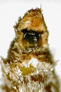 | Die Genitalplatte bei den Thera variata-Weibchen ist in der Regel deutlich heller, rotbraun honigfarbig. | Bei Thera britannica ist die Genitalplatte viel dunkler, schwarzbraun. |