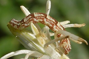 Die Chloroclystis v-ata-Raupe ist nie so schlank wie eine Eupithecia tripunctaria-Raupe.