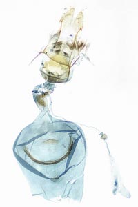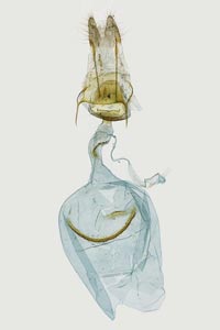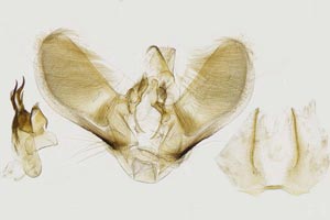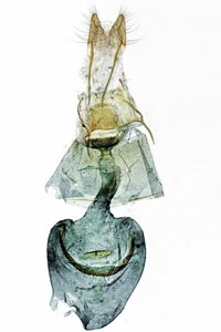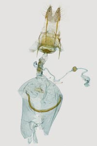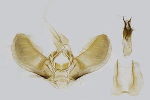 1: Genitalpräparat des unter Lebendfalter 1 abgebildeten ♂, Österreich, Niederösterreich, Mödling, tiefgründige pannonische Halbtrockenrasen, Hecken, 12. Mai 2007, am Licht (Präparation & Mikro-Foto: Peter Buchner)