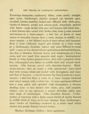 - Original description: Lucas, T. P. (1892): On 34 new species of Australian Lepidoptera, with additional localities, &c. — The Proceedings of the Royal Society of Queensland 8 (3): 68-94. Brisbane (Pole, Outridge & Co.).