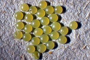 2: weitere Eier vom gleichen ♀ wie Bild 1, Fundort wie Bild 1, ♀ leg. und zur Eiablage gebracht Stefan Ratering (Foto am 3. Juli 2008: Heidrun Melzer)
