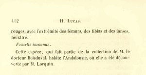 Der in der Erstbeschreibung genannte Typenfundort Andalusien ("l'Andalousie") ist wahrscheinlich falsch. P.J.M. Lorquin hatte auch in Algerien gesammelt, wo die Art auch heute noch vorkommt, so dass Fundort-Verwechslung in der coll. Boisduval wahrscheinlich ist. Damit fehlen Belege für ein Vorkommen in Europa. Siehe hierzu auch [Forumsbeitrag Hermann Falkenhahn, 20. November 2016]