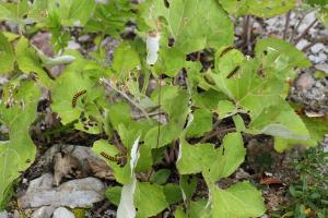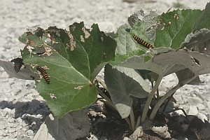 Insbesondere in höheren Lagen spielen hingegen Tussilago farfara (Huflattich), Petasites albus und Petasites paradoxus eine größere Rolle. [Tina Schulz] zeigte aber auch aus den Tieflagen von Niedersachsen Raupen an Petasites hybridus.