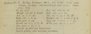 - Bezug einer Indikation in der Erstbeschreibung: Blankaart, S. (1688): Schou-Burg der Rupsen, Wormen, Maden, en Vliegende Dierkens daar uit voortkomende: Unpaginiertes Vorwort, 1-234, pl. I-XVI. Amsterdam (Jan ten Hoorn).