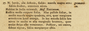 - Erstbeschreibung: Fabricius, J. C. (1775): Systema entomologiae, sistens insectorum classes, ordines, genera, species, adiectis synonymis, locis, descriptionibus, observationibus. 1-832 (Flensburg und Leipzig: Officina Libraria Kortii).