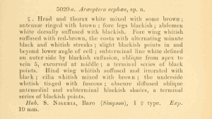 - Erstbeschreibung: Hampson, G. F. (1914): Descriptions of new Genera and Species of Noctuidae. — The Annals and Magazine of Natural History, Including Zoology, Botany, and Geology. Eighth Series 13: 146-175. London (Taylor and Francis). — Digitalisat auf www.archive.org: [167].