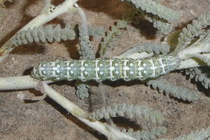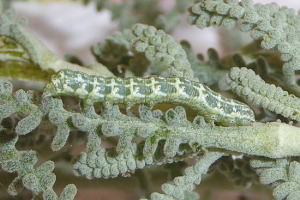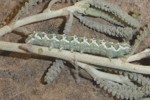 Die oben gezeigten Raupen von Zentralsardinien wurden von Christian Siegel an "Santolina sp." gefunden. Meist wird einfach "Santolina sp." genannt. Giorgi et al. (2022) untersuchten die drei Santolina-Sippen auf Sardinien und Korsika in einem integrativen, morphologisch und genetischen Ansatz und kamen dabei zum Schluss, dass sich die tetraploiden Sippen von "S. corsica" weder auf Art- noch auf Unterartebene von den hexaploiden Sippen von S. insularis trennen lassen, weshalb sie synonymisiert werden müssen. Die pentaploide Santolina chamaecyparissus (Graues Heiligenkraut) ist davon schwach, aber ausreichend, differenziert, doch handelt es sich bei ihr um eine reine Kulturart, die als solche in Europas Steingärten Eingang gefunden hat - ob sie irgendwo auf Sardinien tatsächlich auch als Freiland-Raupennahrung genutzt wird, bleibt noch zu klären. Die oben gezeigten Raupen betreffen jedenfalls Santolina corsica.