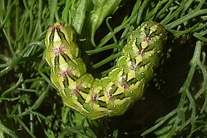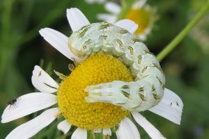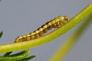 13-16: zwei Individuen (L6), Deutschland, Niedersachsen, Rodenberg, 90 m, Garten, Eier 16. Mai 2020 an Tripleurospermum inodorum (Geruchloser Strandkamille), Filago minima (Kl. Filzkraut) und Anthemis tinctoria (Färberkamille), Zuchtfotos 10. Juni 2020 (leg., cult., det. & fot.: Tina Schulz)Forum