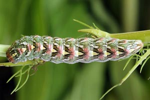 2-5: vier verschiedene Raupen, Deutschland, Sachsen, nordwestlich von Leipzig, Luppenaue, Feldrand, an Kamille (Tripleurospermum inodorum), leg. 6. Juni 2007 (Studiofotos am 10. Juni 2007: Heidrun Melzer), leg., cult. & det. Heidrun Melzer