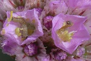 Ein wichtiges Unterscheidungsmerkmal bei den männlichen Genitalien ist der Aufbau und die Form des Aedeagus. Die Pfeile im Bild weisen auf die Unterschiede zwischen H. adaucta und H. viriplaca hin: