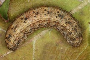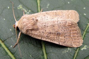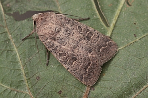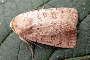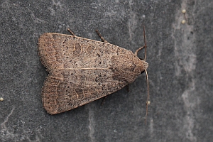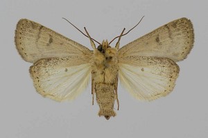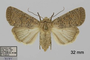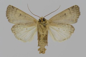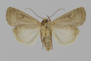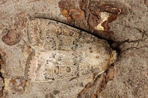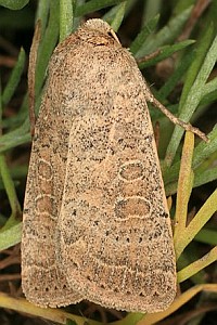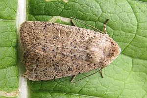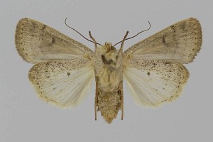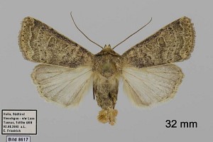 Vorderflügel hell graubraun (beige) mit verstreuter schwarzer Beschuppung, die im Basalfeld und in den Makeln meist am stärksten ausgeprägt ist. Hinterflügel beim Männchen weißlich mit graubraunem Außenrand, beim Weibchen graubraun mit dunklen Adern. [Axel Steiner]