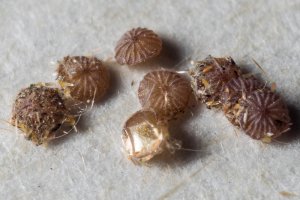 1: arttypisch an Eschenknospe gelegte Eier, Deutschland, Nordrhein-Westfalen, mittleres Ruhrtal, Schwerte, leg. ♀ 1. September 2006, Eiablage ab 5. September (Studiofoto: Hans-Joachim Weigt), cult. & det. Hans-Joachim WeigtForum