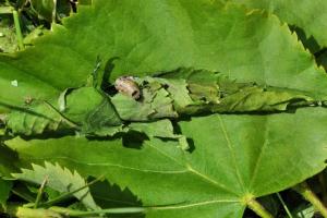 2: Raupe in Blattrolle von Lindenblättern, Deutschland, Hessen, Gießen, Stadtrand, Waldrand, 218 m, Tagfund, 29. April 2017 (Foto: Hans Bahmer), det. Hans Bahmer nach Suchhinweis von Daniel BartschForum