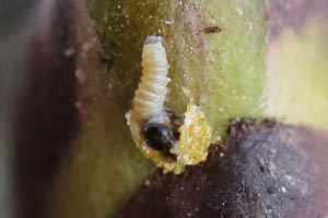 6: frisch geschlüpfte Raupe bohrt sich in Lindenaustrieb (Tilia spec.) ein: Deutschland, Bayern, Münchner Süden, 570 m, 27. März 2021 (Zuchtfoto: Christine Neumann)Forum
