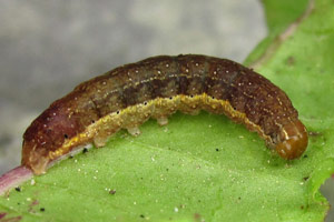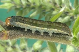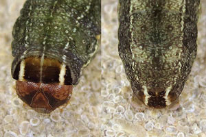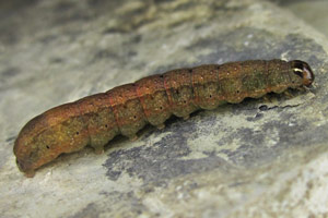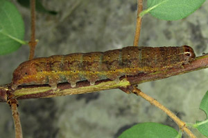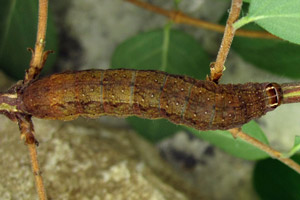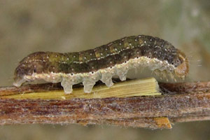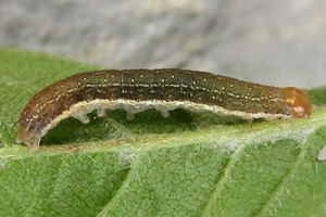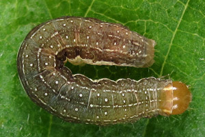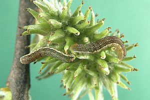 9-10: L4, 10 mm: Deutschland, Niedersachsen, Rodenberg, 90 m, 5. Mai 2015 Raupe nachts an Berberis thunbergii 'Atropurpurea' (Berberitze) geleuchtet, Fotos 14. Mai 2015 (cult. ad imaginem & fot.: Tina Schulz), det.: Thomas Fähnrich & Tina SchulzForum