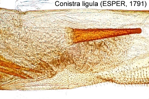 1: links Conistra ligula, rechts C. vaccinii: Deutschland, Baden-Württemberg, Schriesheim, "Huberweg", Wohnstraße im Wald, 160 m, 25. Oktober 2020, Tagfund bei Laternen (det. & Studiofoto: Thomas Jungbluth), conf. Thomas Fähnrich und Tina Schulz)Forum