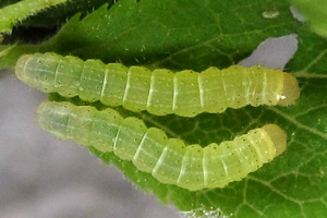 7-8: L3, 8 mm: Deutschland, Niedersachsen, Rodenberg, 90 m, 5. Mai 2015 Raupe nachts an Berberis thunbergii 'Atropurpurea' (Berberitze) geleuchtet, Fotos 9. Mai 2015 (cult. ad imaginem & fot.: Tina Schulz), det.: Thomas Fähnrich & Tina SchulzForum